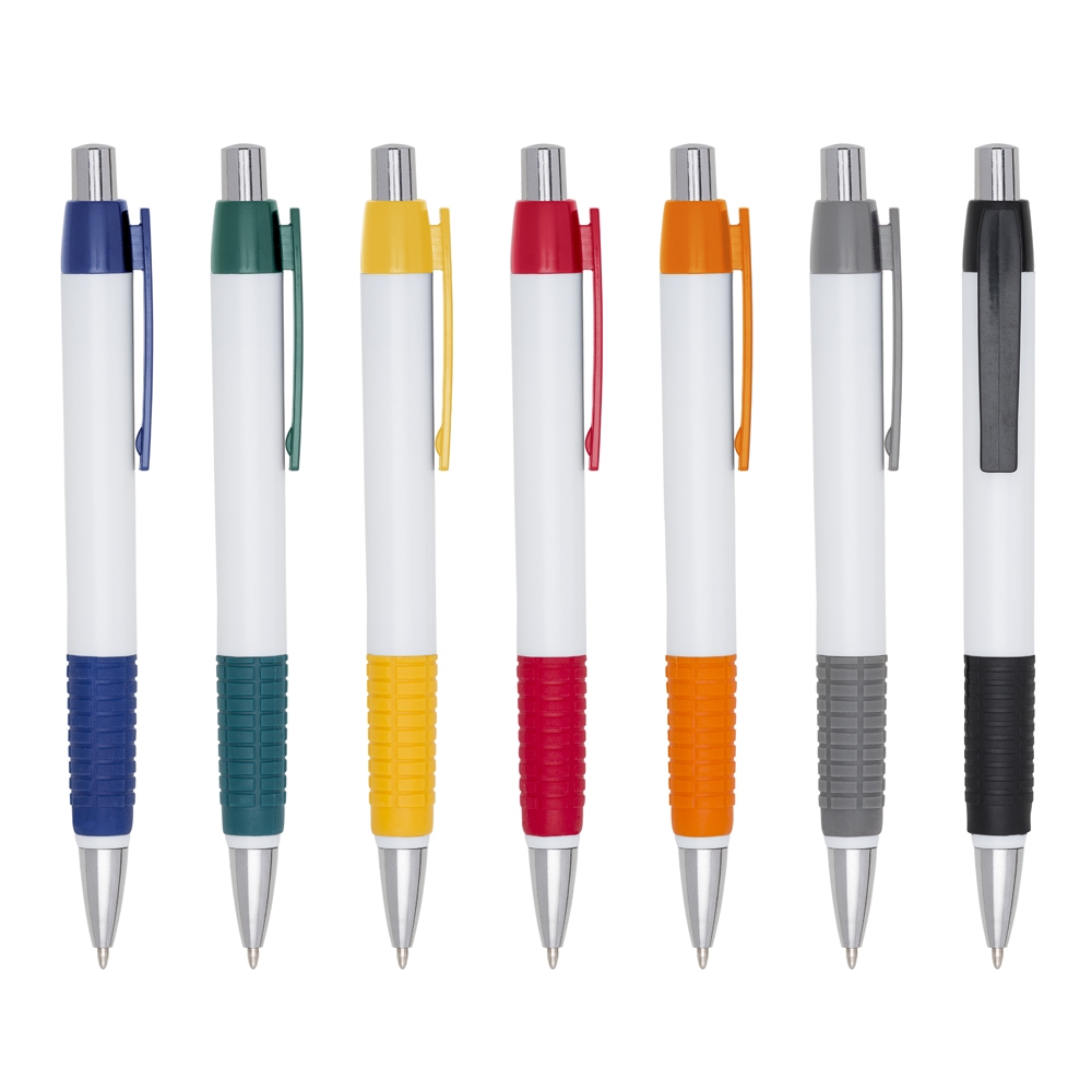 Caneta plástica com detalhe emborrachado, carga esferográfica azul 1.0 mm e acionamento por clique.