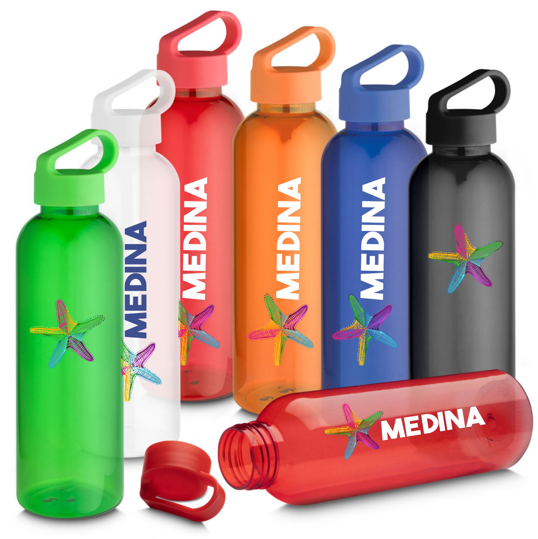 Garrafa *RPET com capacidade de 550ml. Tampa plástica rosqueável com alça de transporte integrada.